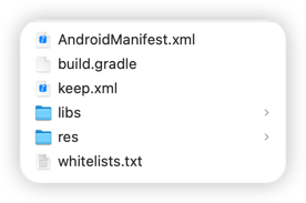 - 如果您的应用有用到第三方的资源优化框架(如:AndResProguard),则需要将解压出的whitelists.txt文件的内容添加到资源优化框架的