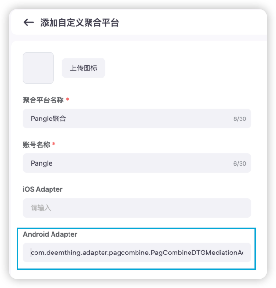 ⚠️ 注意: 请务必填写需要使用的Adapter的 全路径 类名 com.deemthing.adapter.pagcombine.PagCombineDTGMediationAdapter