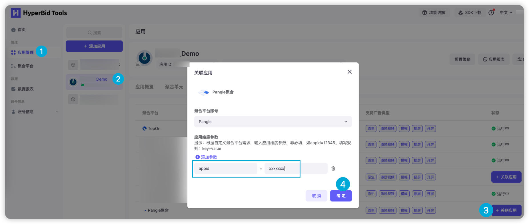 - 在完成自定义聚合平台账号录入后,您还需要在对应的应用下关联已添加的自定义聚合平台账号,配置自定义聚合平台下需要的应用维度参数,到此才完成最终关联应用的操作。