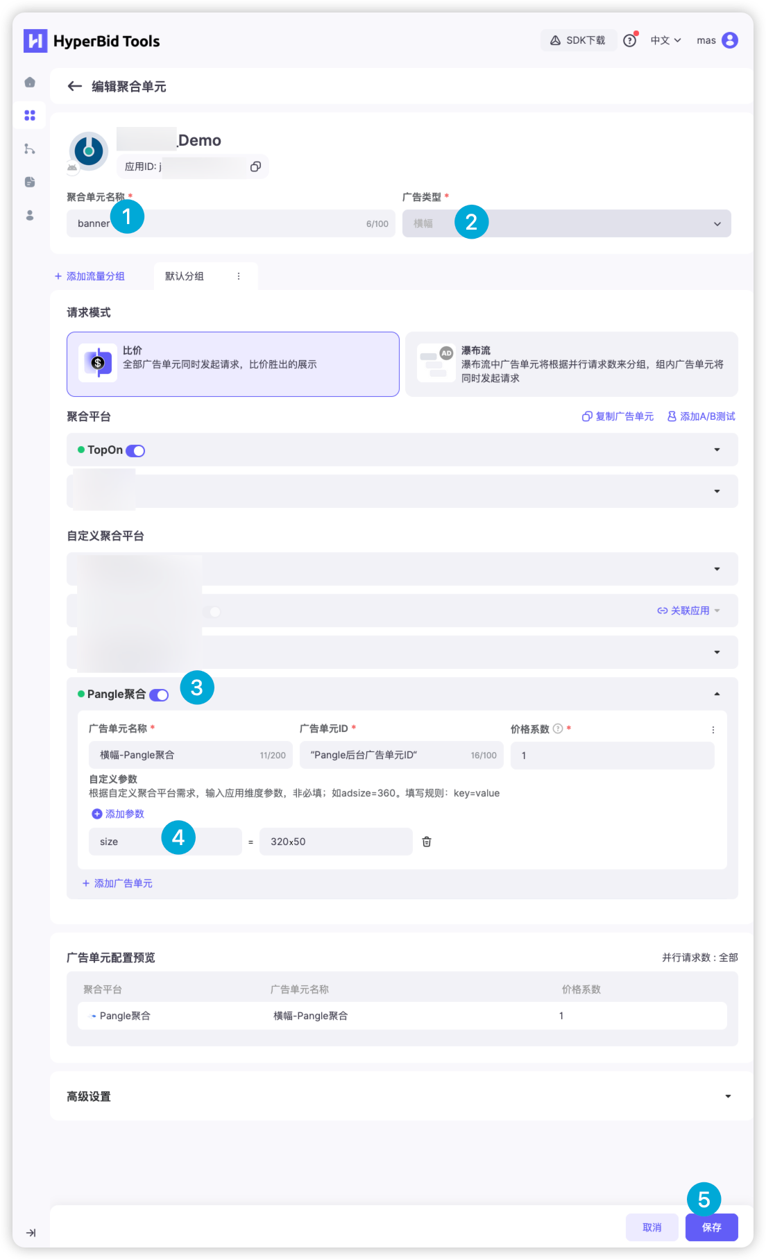 - ⚠️ 注意:上图以Pangle聚合平台的横幅广告样式为例,填写广告单元参数